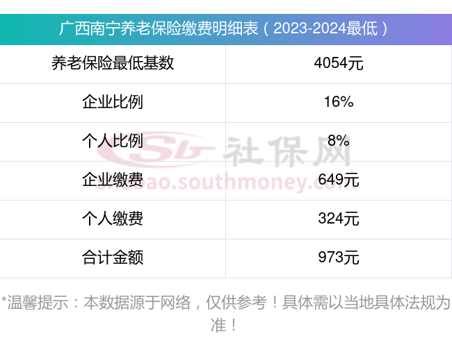 据新社通app显示,广西南宁职工养老保险最低缴费基数为:4053.6元;单位和个人的缴费比例分别为:16%、8%;
