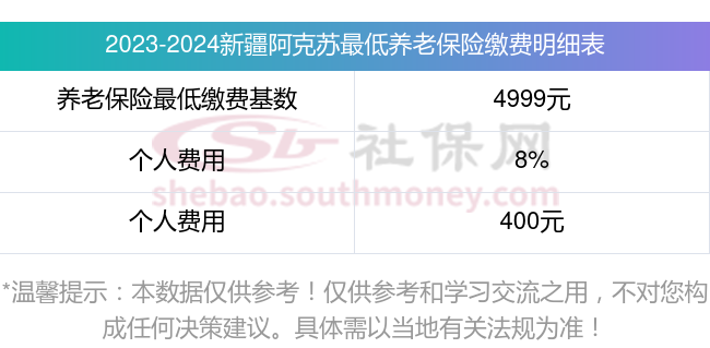 据新社通app显示,新疆阿克苏职工养老保险最低缴费基数为:4999元;单位和个人的缴费比例分别为:16%、8%;
