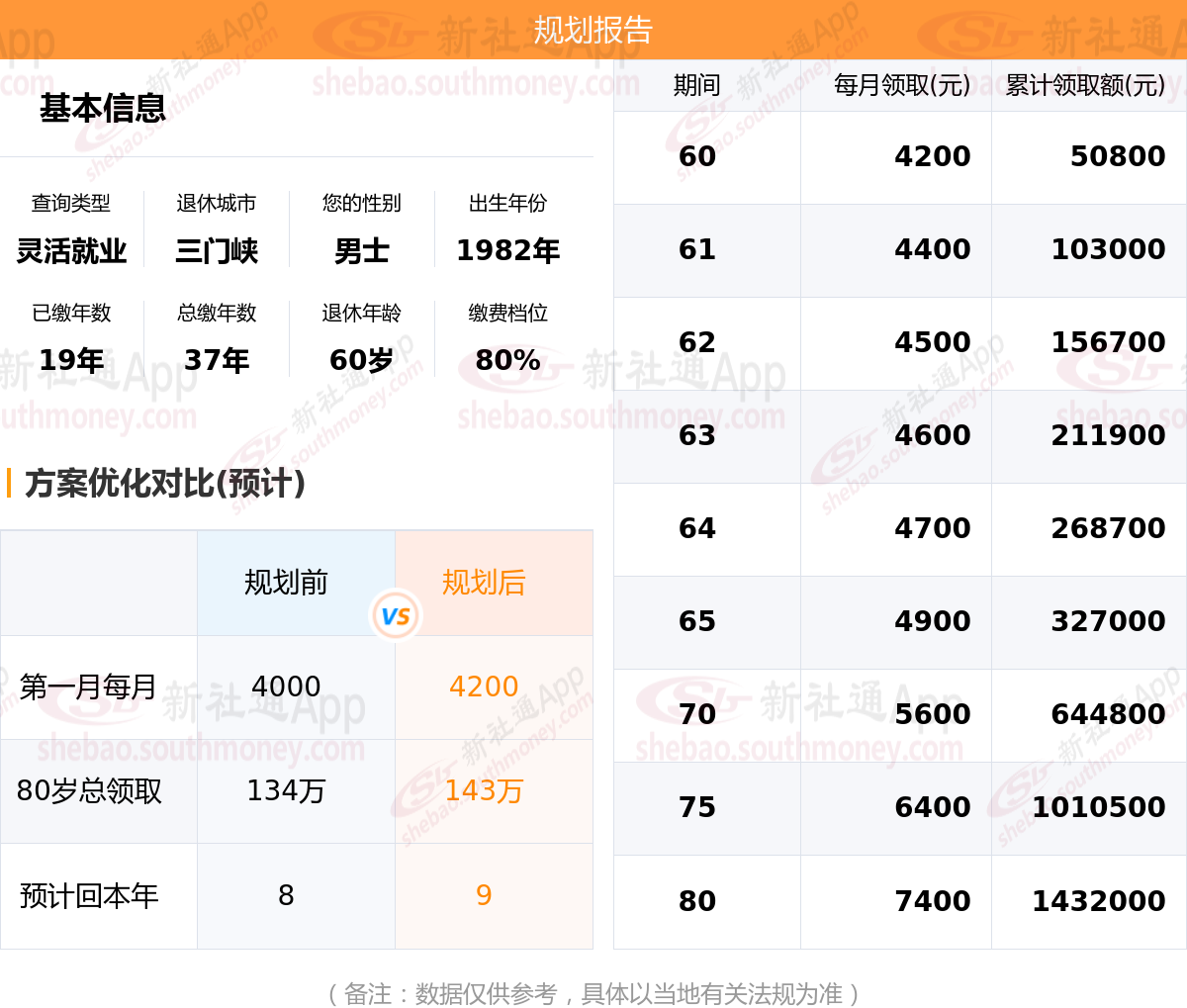 规划前:60岁第一个月约领4000元,新社通APP-养老金规划后:60岁第一个月约领4200元