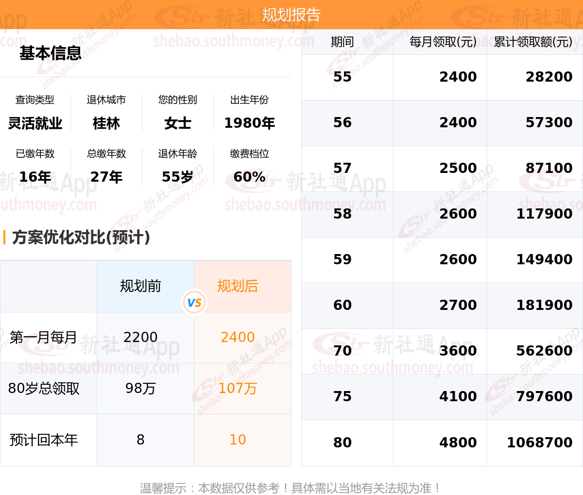 规划前:参保城市:广西桂林,性别:女士,出生年月:1980,已缴年限:16年,总缴年数:27年,退休年龄:55岁,缴费档位:60%。