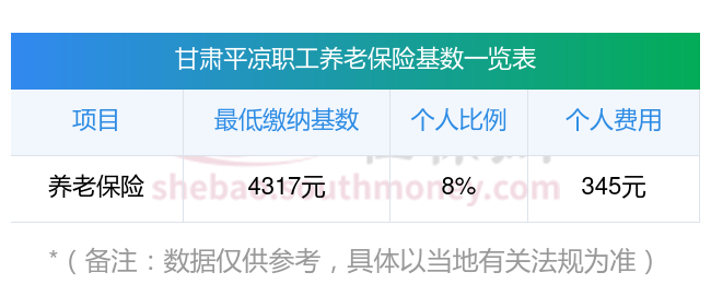 假设甘肃平凉的养老保险缴费基数为4317元,个人按照8%的比例缴纳养老保险费用,企业按照16%的比例缴纳。则该职工的养老保险缴费计算如下: