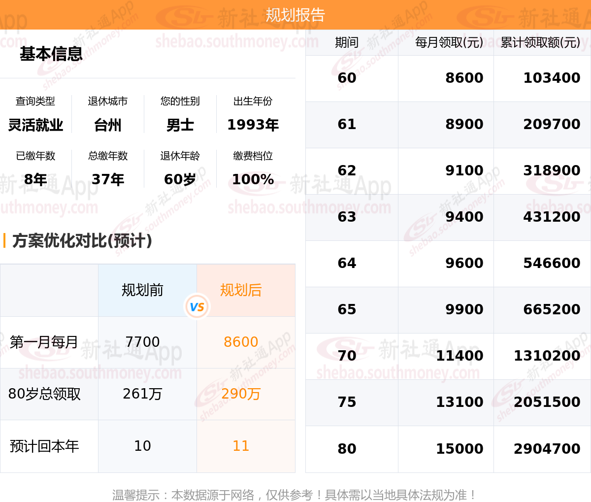 规划前:60岁第一个月约领7700元,新社通APP-养老金规划后:60岁第一个月约领8600元