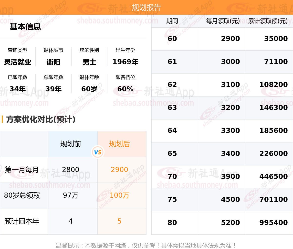 规划前:参保城市:湖南衡阳,性别:男士,出生年月:1969,已缴年限:34年,总缴年数:39年,退休年龄:60岁,缴费档位:60%。