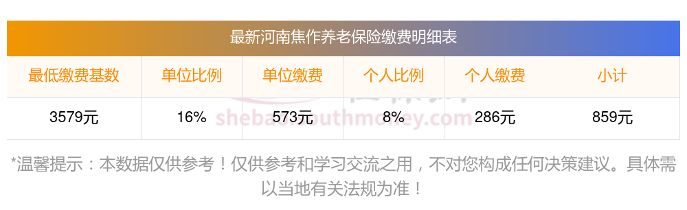2024年河南焦作城镇职工基本养老保险缴费基数的下限为3579元。河南焦作职工基本养老保险由用人单位和职工分别按其缴费基数的16%和8%按月共同缴纳。河南焦作养老金一个月缴费金额如下: