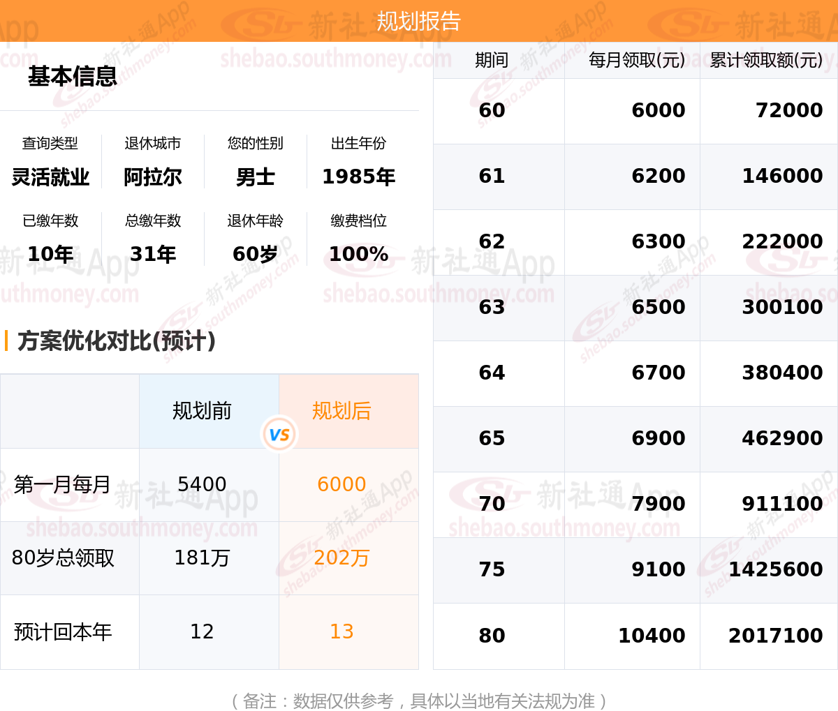 规划前:60岁第一个月约领5400元,新社通APP-养老金规划后:60岁第一个月约领6000元