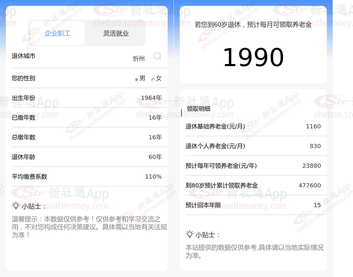 退休城市:山西忻州,性别:男,出生年份:1964,总缴年数16年,缴费档次:110%,新社通app养老金计算器所得: