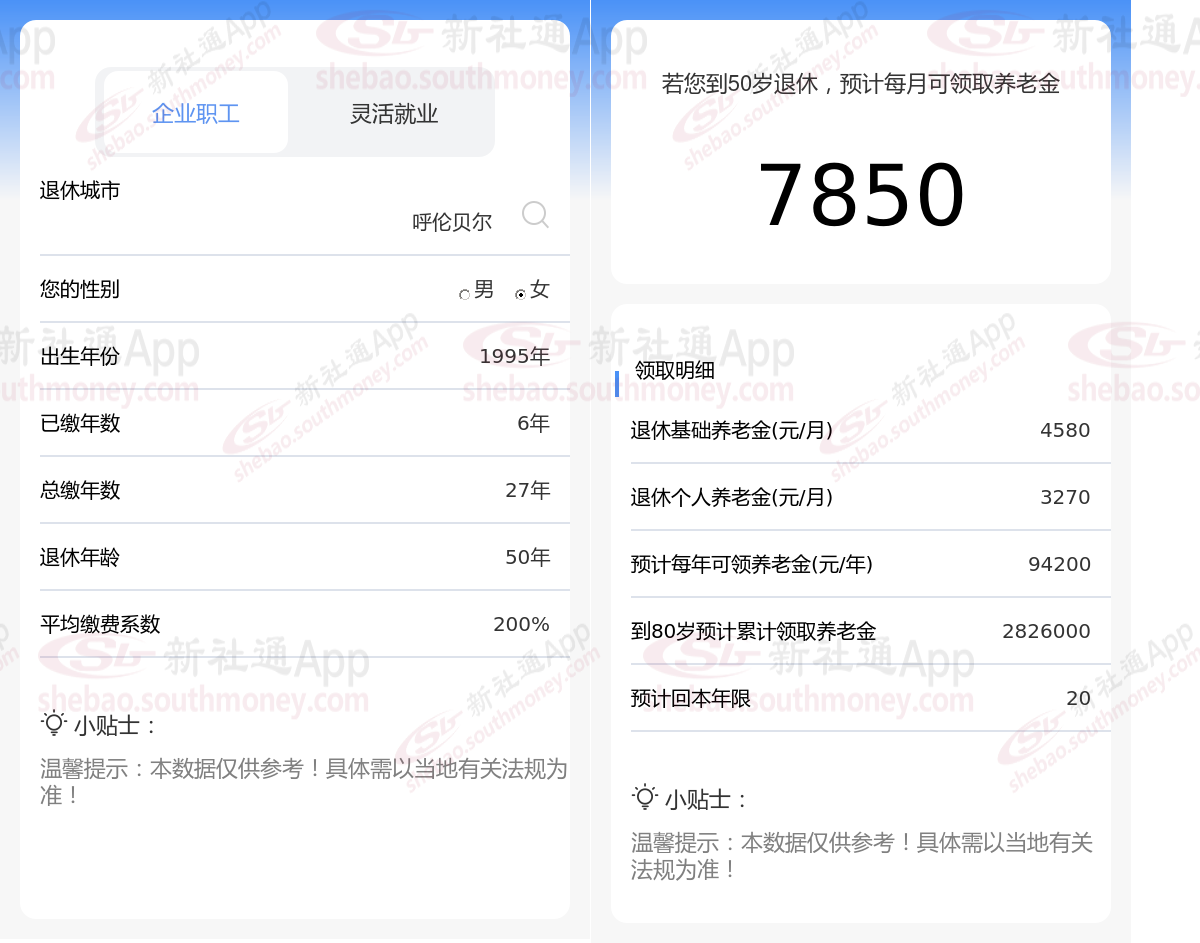 通过新社通APP-养老金计算所得:退休城市、出生年份、退休年龄、缴费系数都相同的情况下,社保缴费年限累计27年时,计算如下: