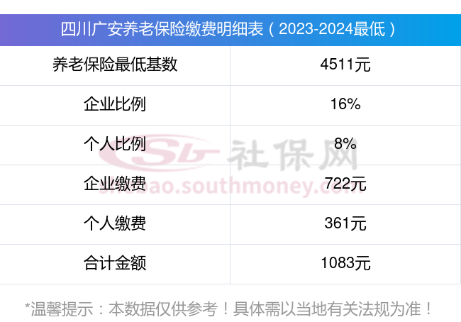 四川广安养老保险缴费基数2023-2024年最新标准(最低)