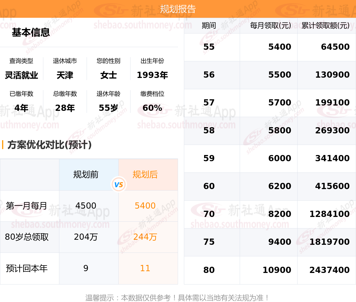 规划前:参保城市:天津,性别:女士,出生年月:1993,已缴年限:4年,总缴年数:28年,退休年龄:55岁,缴费档位:60%。