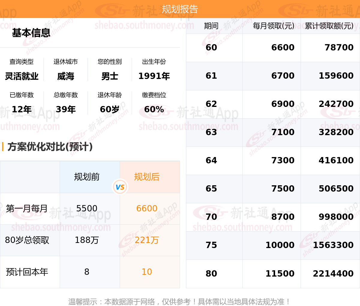 规划前:参保城市:山东威海,性别:男士,出生年月:1991,已缴年限:12年,总缴年数:39年,退休年龄:60岁,缴费档位:60%。