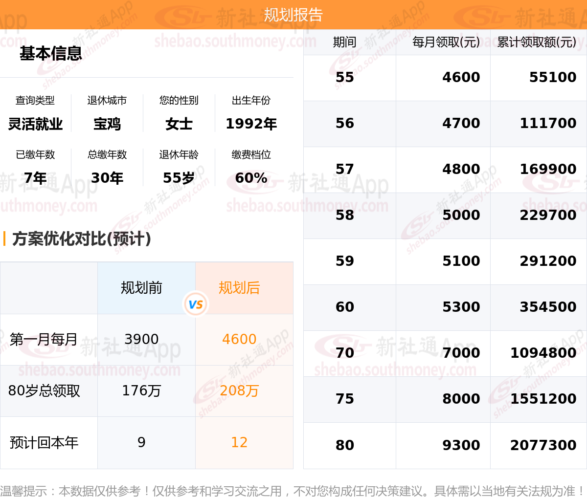 规划前:55岁第一个月约领3900元,新社通APP-养老金规划后:55岁第一个月约领4600元