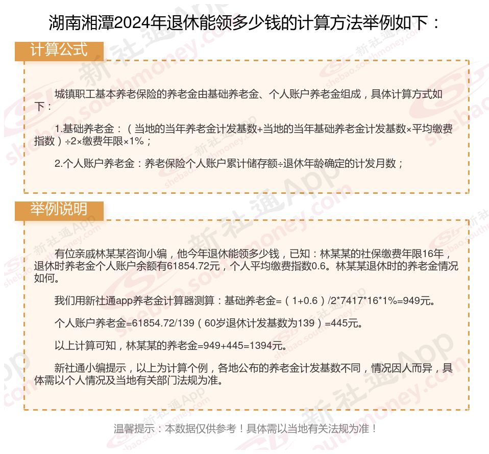 湖南湘潭养老金计算公式2024年计算方法(在线计算器)