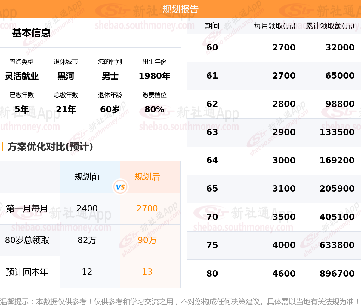 规划前:参保城市:黑龙江黑河,性别:男士,出生年月:1980,已缴年限:5年,总缴年数:21年,退休年龄:60岁,缴费档位:80%。