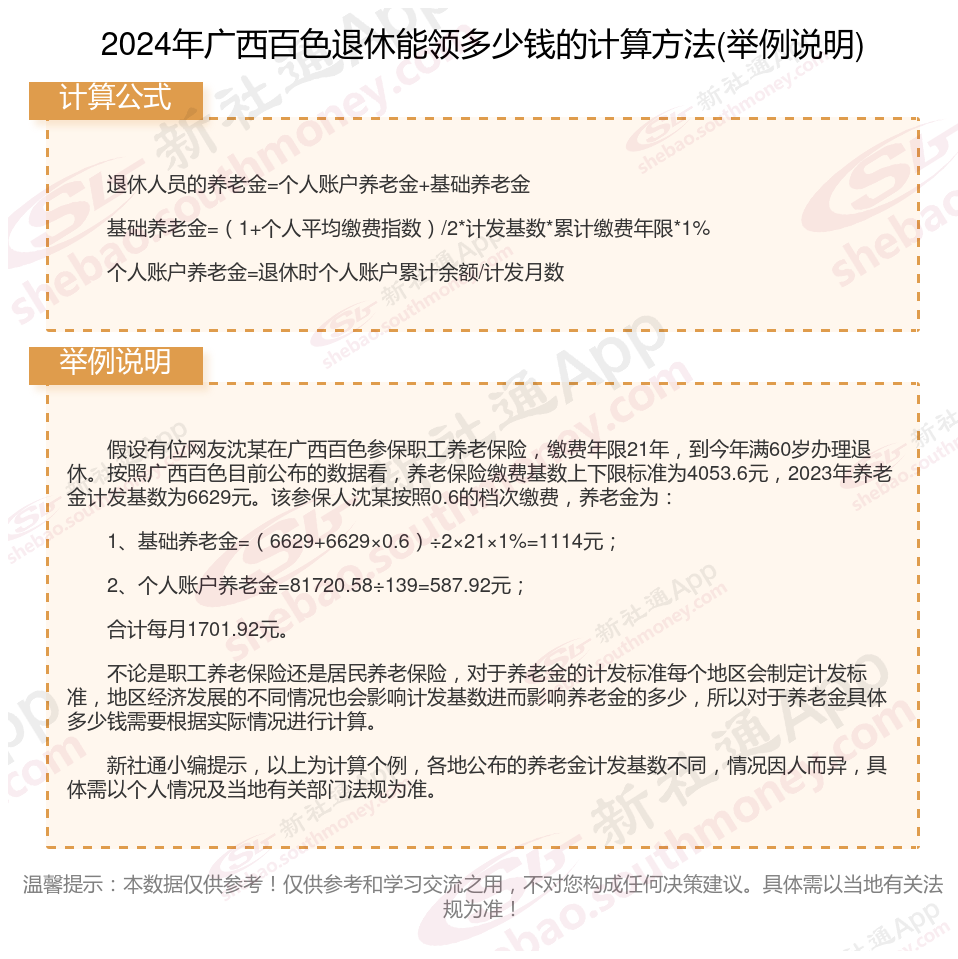 广西百色养老金计算公式2024年计算方法(在线计算器)