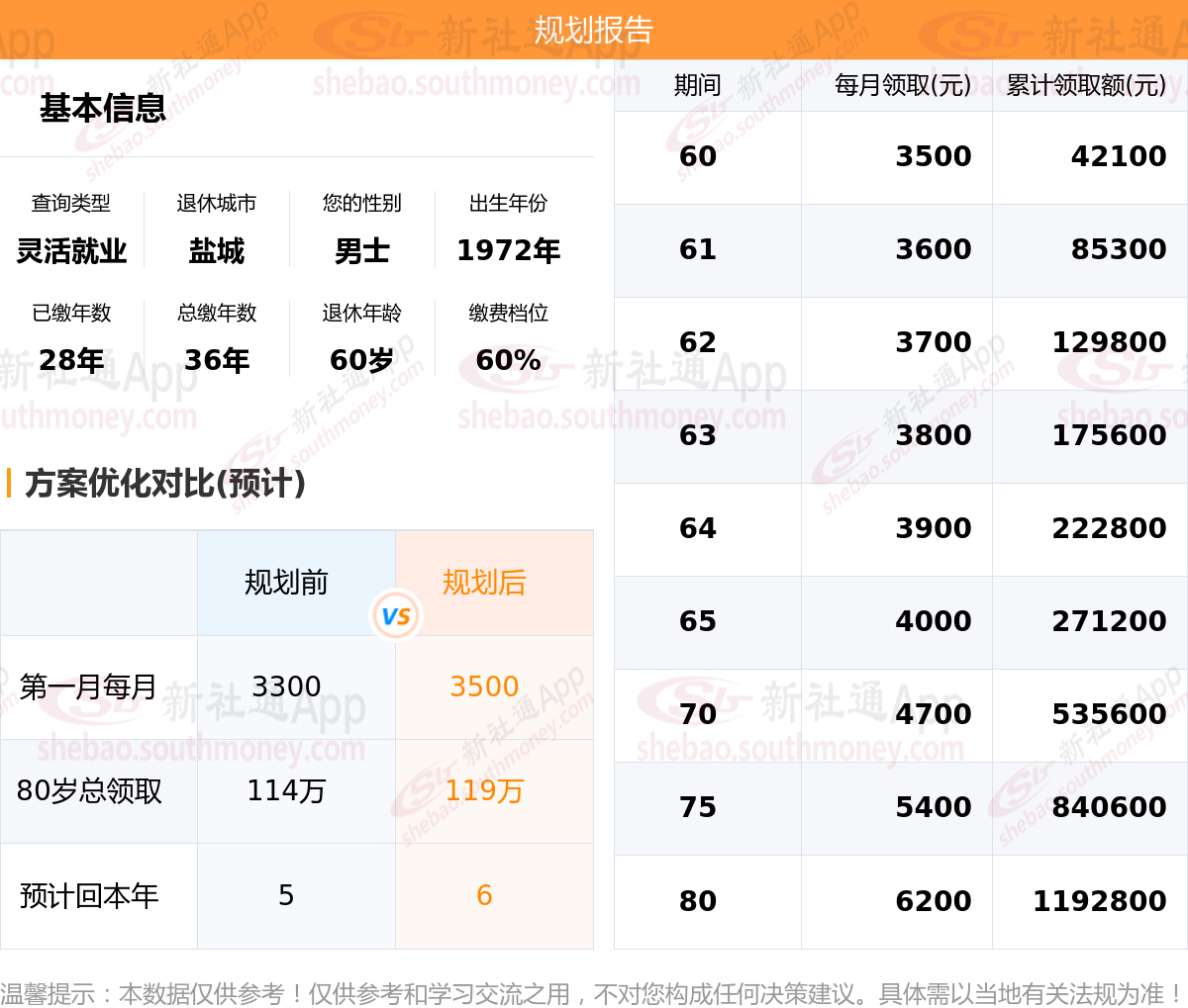 规划前:60岁第一个月约领3300元,新社通APP-养老金规划后:60岁第一个月约领3500元