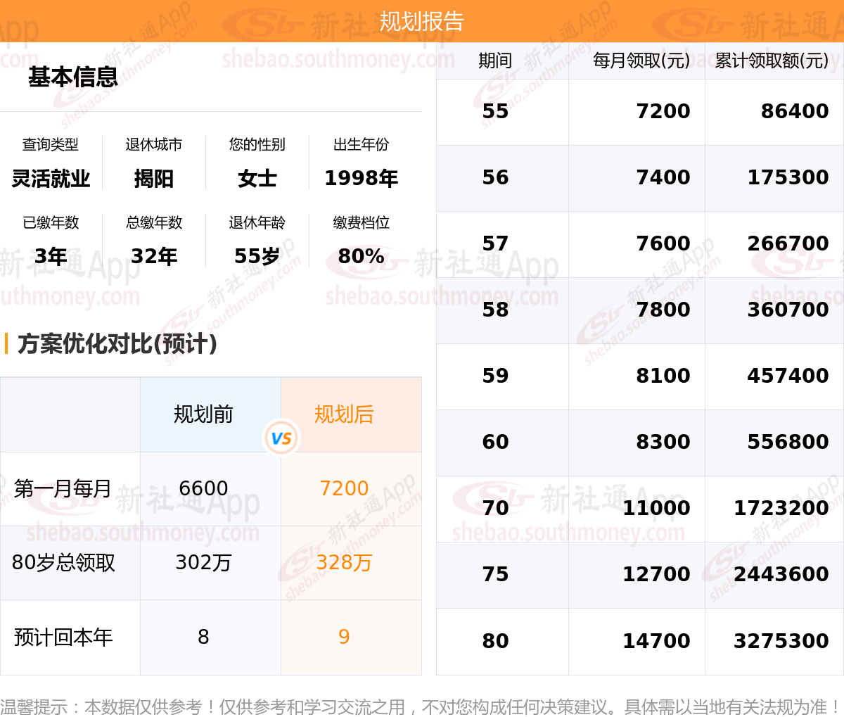 规划前:参保城市:广东揭阳,性别:女士,出生年月:1998,已缴年限:3年,总缴年数:32年,退休年龄:55岁,缴费档位:80%。