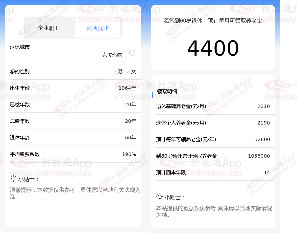 退休城市:新疆克拉玛依,性别:男,出生年份:1964,总缴年数20年,缴费档次:190%,新社通app养老金计算器所得: