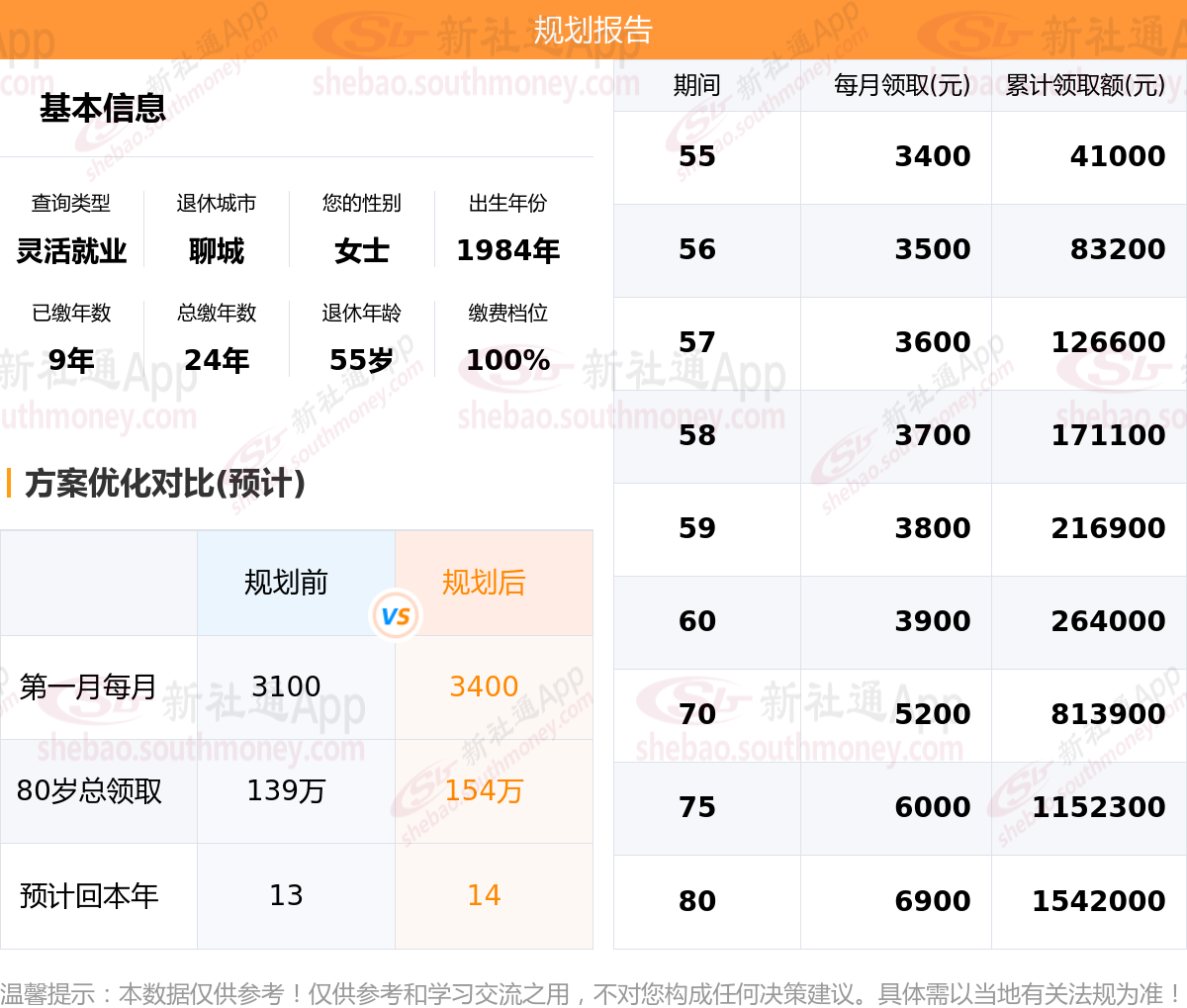 规划前:55岁第一个月约领3100元,新社通APP-养老金规划后:55岁第一个月约领3400元