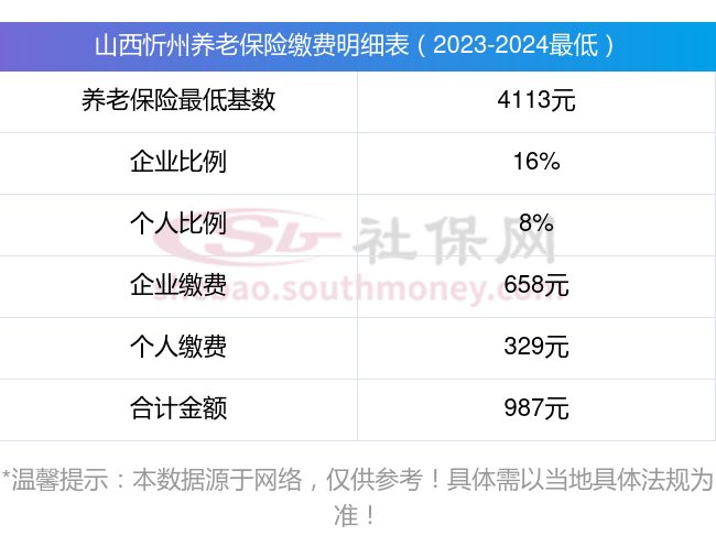 山西忻州养老保险缴费基数2023-2024年最新标准(最低)