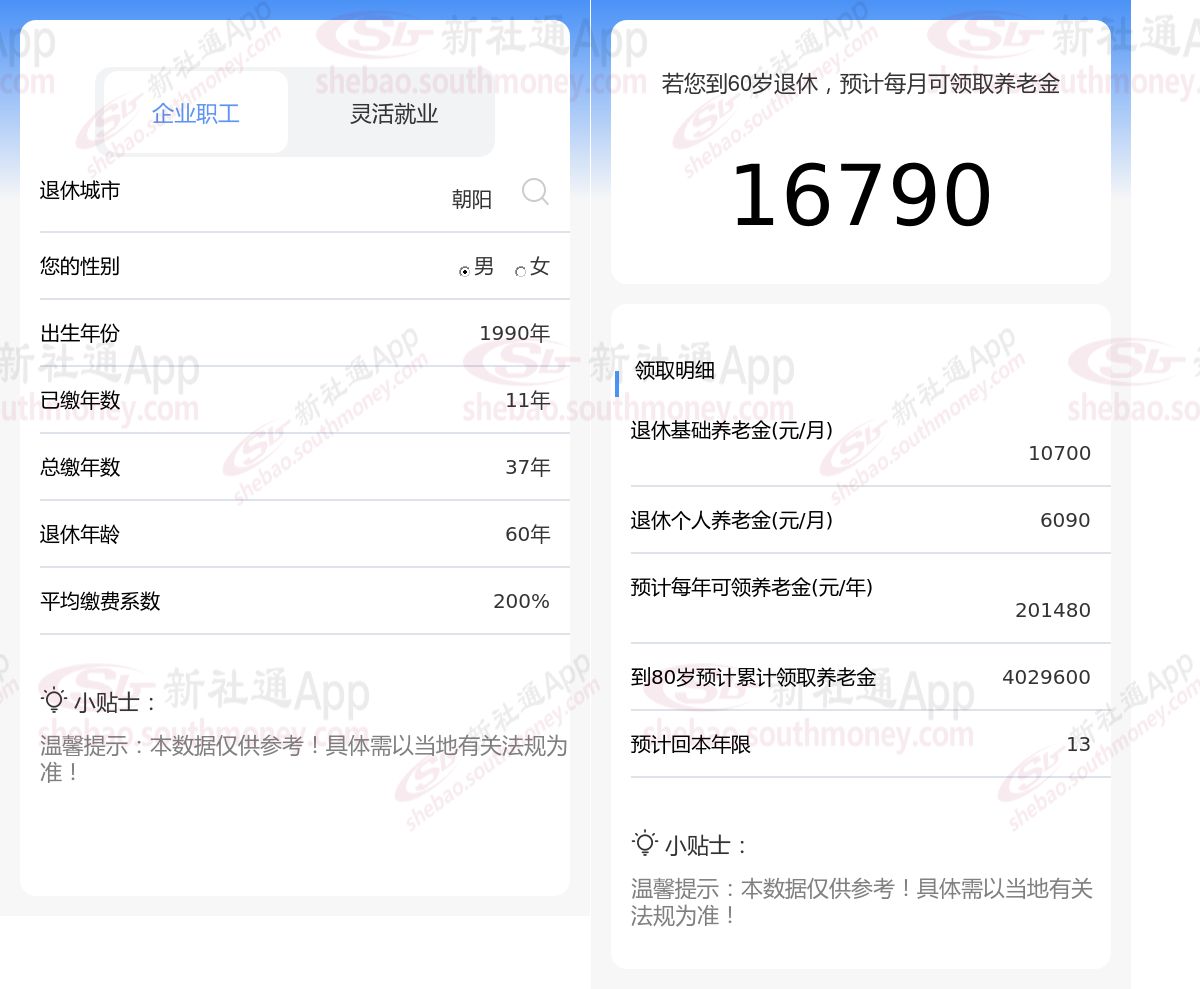通过新社通APP-养老金计算所得:退休城市、出生年份、退休年龄、缴费系数都相同的情况下,社保缴费年限累计37年时,计算如下: