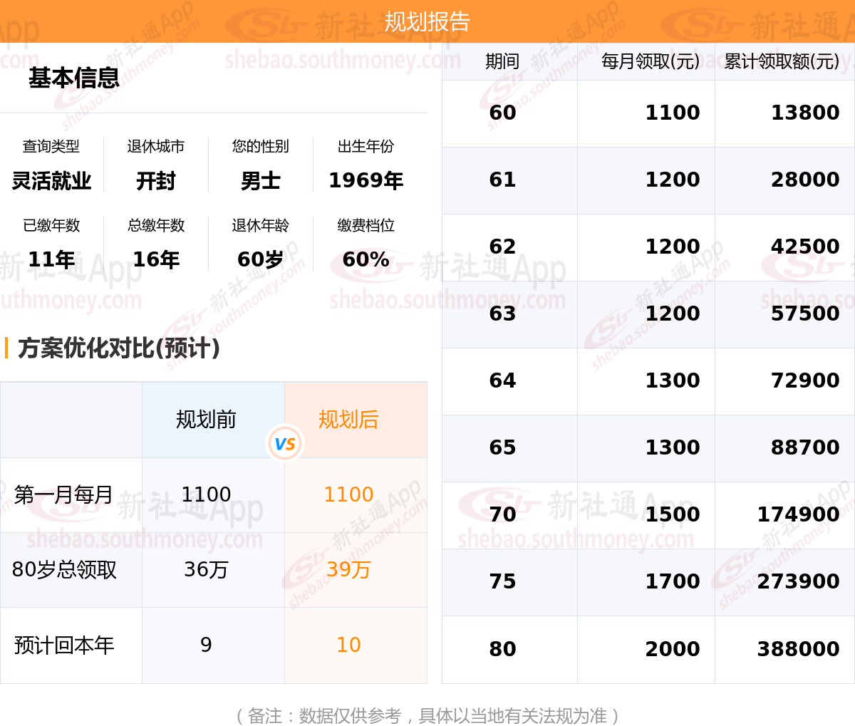 规划前:参保城市:河南开封,性别:男士,出生年月:1969,已缴年限:11年,总缴年数:16年,退休年龄:60岁,缴费档位:60%。