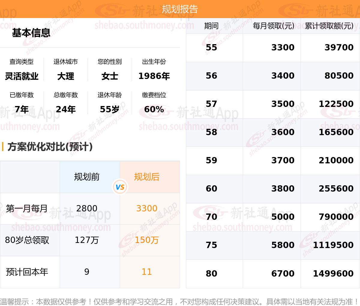 规划前:55岁第一个月约领2800元,新社通APP-养老金规划后:55岁第一个月约领3300元