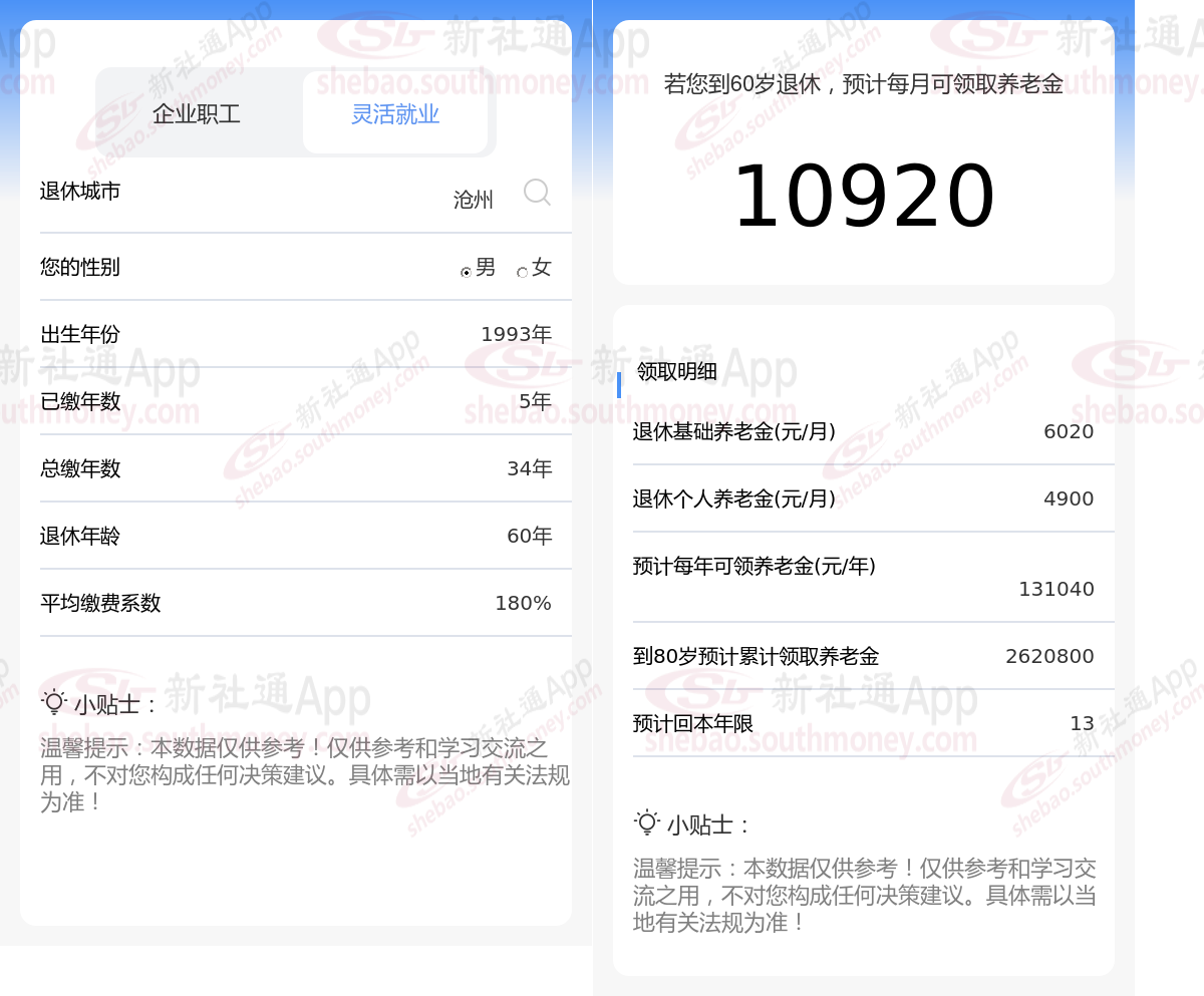 通过新社通APP-养老金计算所得:退休城市、出生年份、退休年龄、缴费系数都相同的情况下,社保缴费年限累计34年时,计算如下: