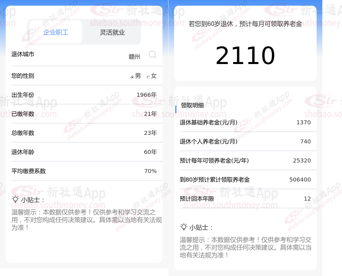 通过新社通APP-养老金计算所得:退休城市、出生年份、退休年龄、缴费系数都相同的情况下,社保缴费年限累计23年时,计算如下: