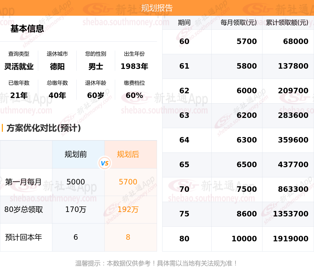 规划前:60岁第一个月约领5000元,新社通APP-养老金规划后:60岁第一个月约领5700元