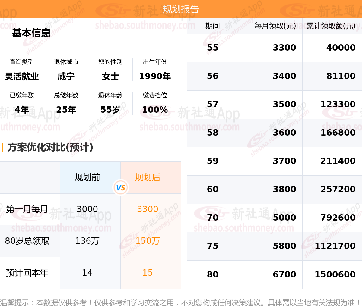 规划前:55岁第一个月约领3000元,新社通APP-养老金规划后:55岁第一个月约领3300元
