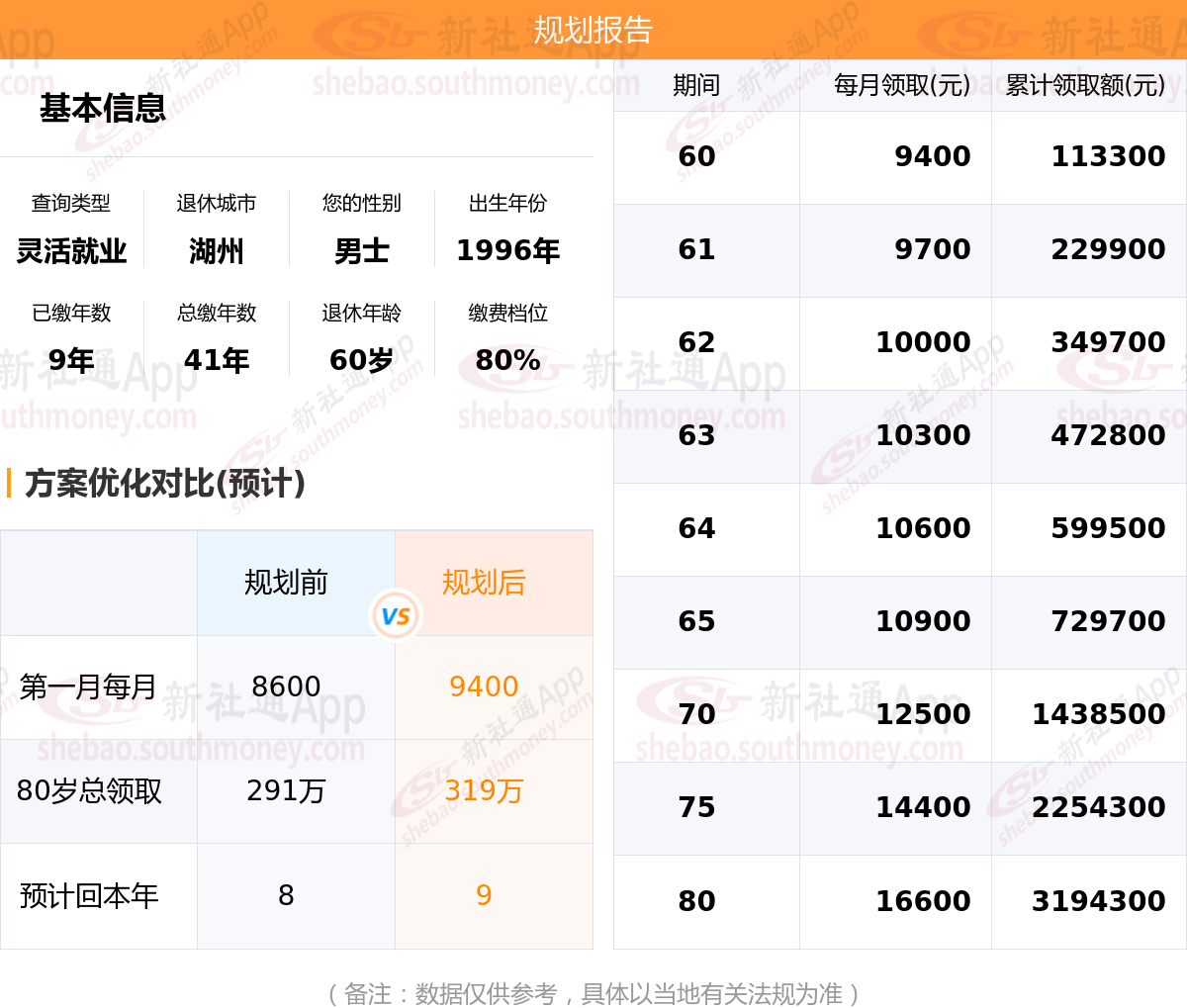 规划前:参保城市:浙江湖州,性别:男士,出生年月:1996,已缴年限:9年,总缴年数:41年,退休年龄:60岁,缴费档位:80%。