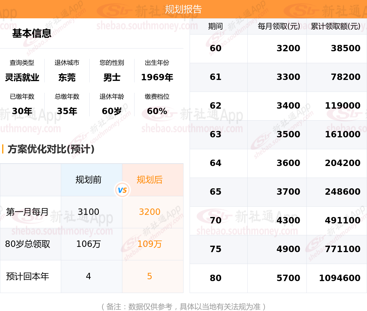 规划前:参保城市:广东东莞,性别:男士,出生年月:1969,已缴年限:30年,总缴年数:35年,退休年龄:60岁,缴费档位:60%。
