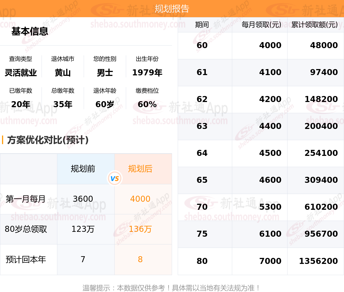 规划前:参保城市:安徽黄山,性别:男士,出生年月:1979,已缴年限:20年,总缴年数:35年,退休年龄:60岁,缴费档位:60%。