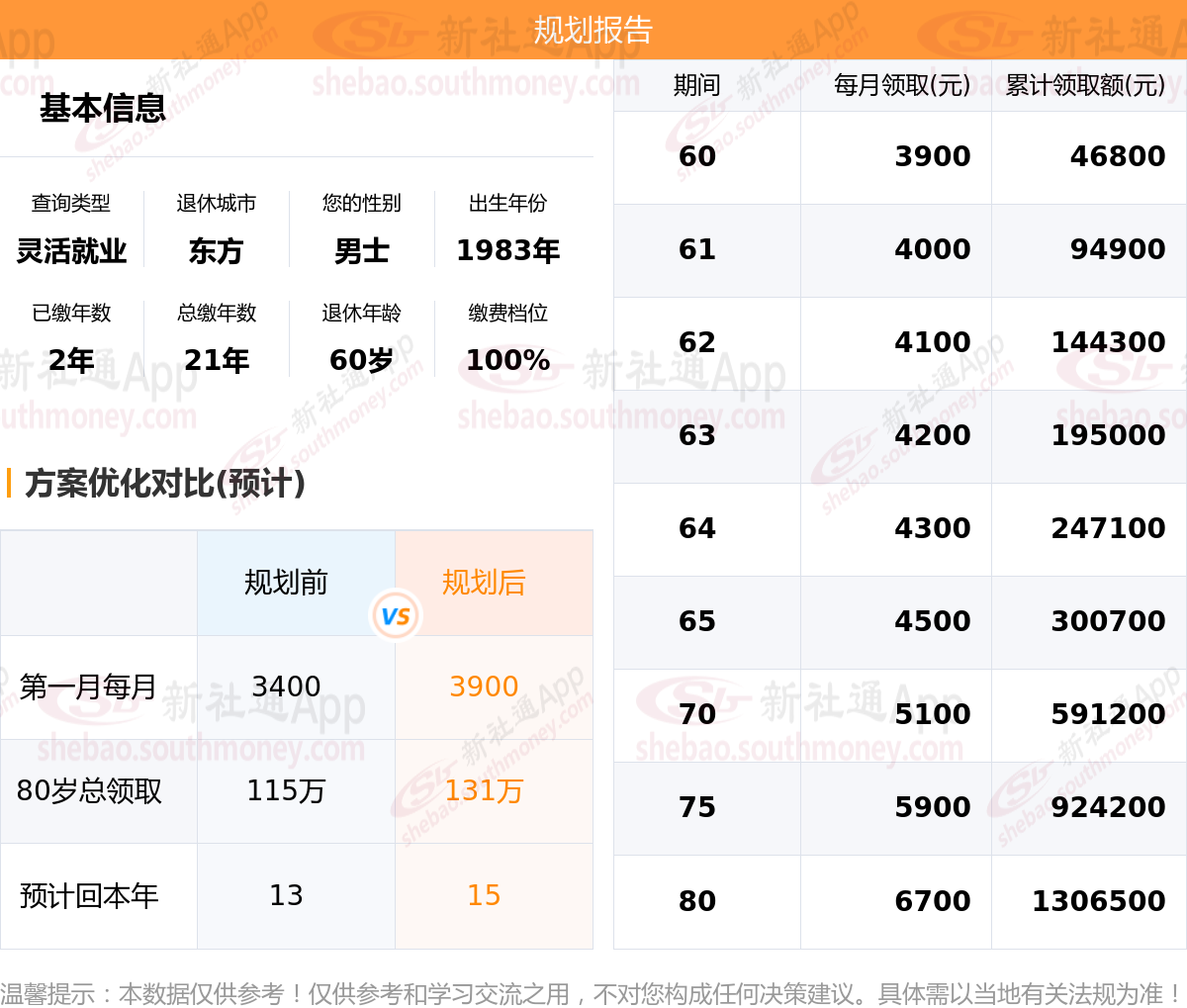 规划前:60岁第一个月约领3400元,新社通APP-养老金规划后:60岁第一个月约领3900元