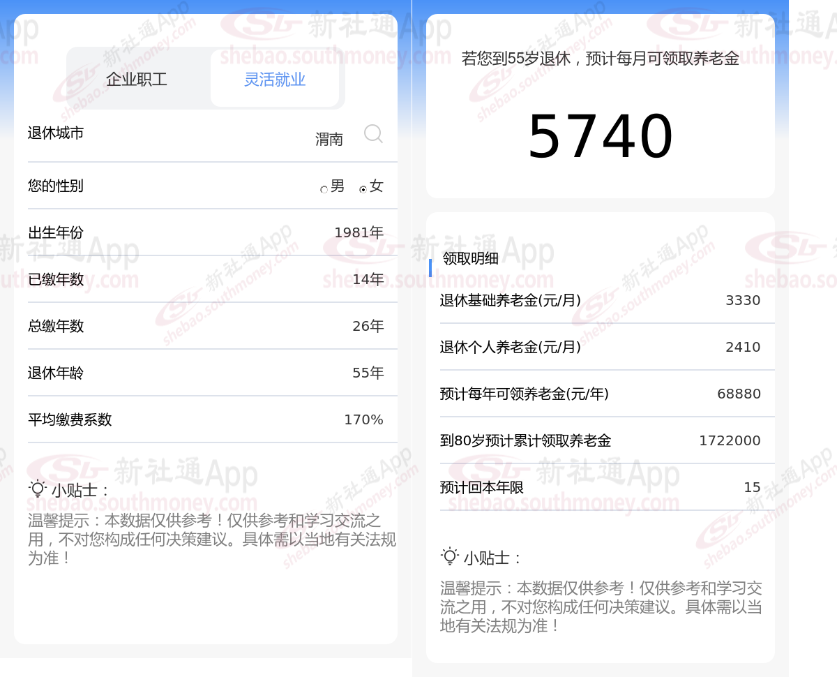 通过新社通APP-养老金计算所得:在保持退休城市、出生年份、退休年龄以及缴费系数这些条件不变的前提下,当个人的社保缴费年限累积达到26年时,其相关计算方式如下: