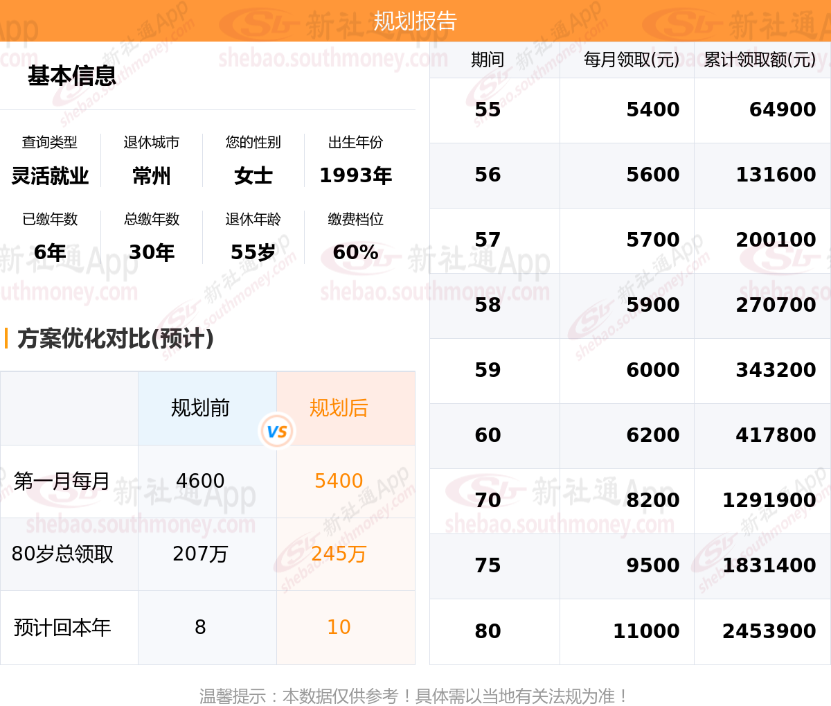 规划前:55岁第一个月约领4600元,新社通APP-养老金规划后:55岁第一个月约领5400元
