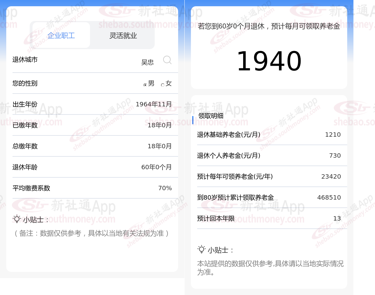 退休城市:宁夏吴忠,性别:男,出生年份:1964,总缴年数18年,缴费档次:70%,新社通app养老金计算器所得: