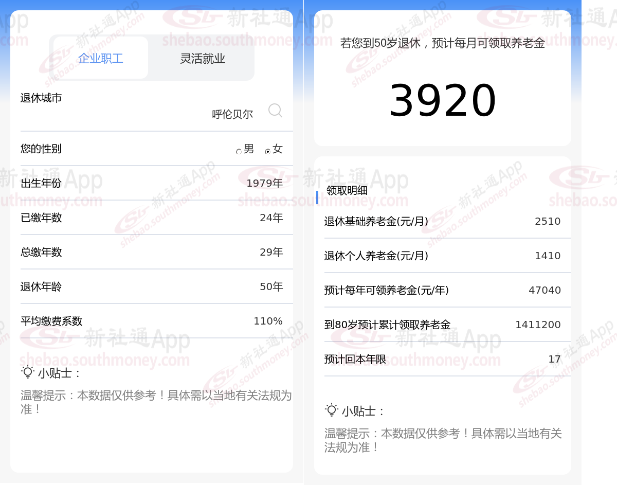 通过新社通APP-养老金计算所得:假设都在内蒙古呼伦贝尔退休、出生年份、退休年龄和缴费系数均保持不变的情况下,若个人的社保缴费年限累计达到29年,那么其相关计算方式如下: