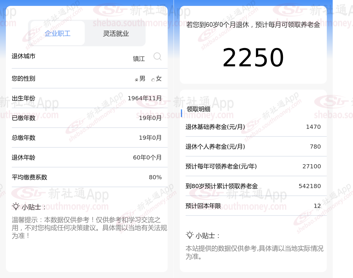 朋友王某某退休城市在江苏镇江,性别:男,出生年份:1964,总缴年数19年,缴费档次:80%,新社通app养老金计算器所得: