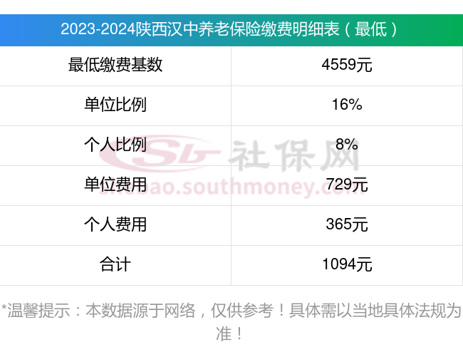 陕西汉中养老保险缴费基数2023-2024年最新标准(最低)