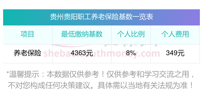 假设贵州贵阳某职工的工资总额为4363.35元,那么他的缴费基数就是4363.35元的60%到300%之间。如果他选择按照缴费基数为4363.35,据新社通app养老保险计算器测算显示,他的个人缴费额就是4363.35元*8%,等于349.07元。