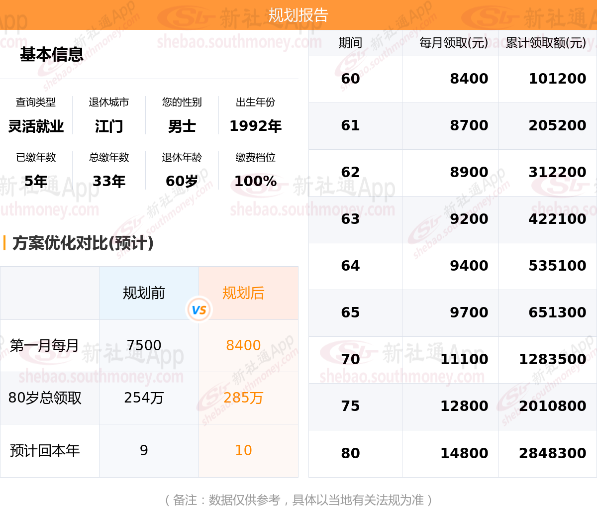 规划前:60岁第一个月约领7500元,新社通APP-养老金规划后:60岁第一个月约领8400元