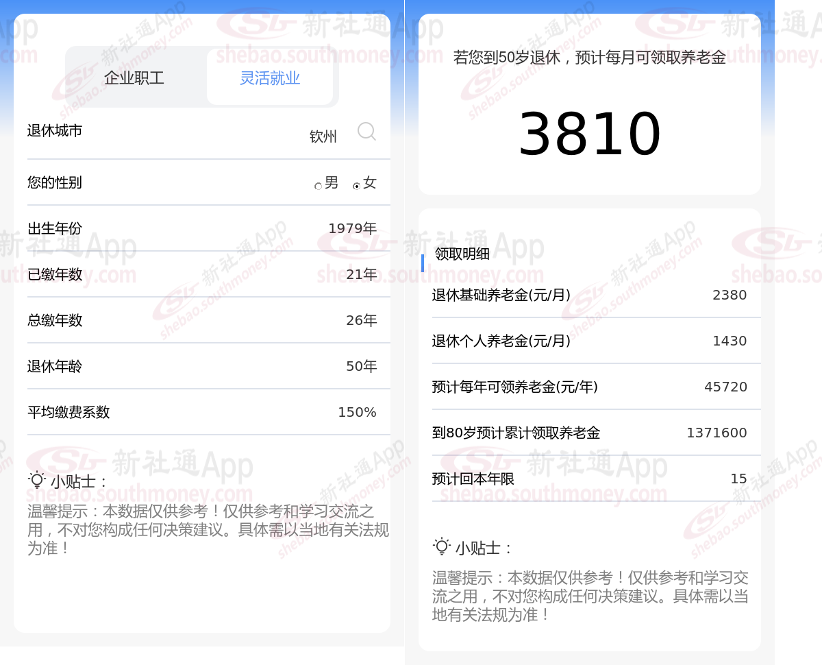 通过新社通APP-养老金计算所得:在保持退休城市、出生年份、退休年龄以及缴费系数这些条件不变的前提下,当个人的社保缴费年限累积达到26年时,其相关计算方式如下: