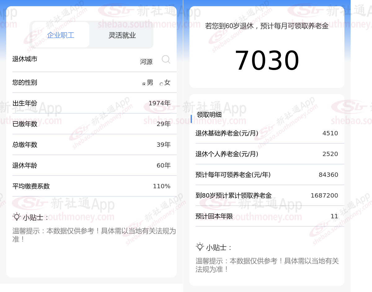 通过新社通APP-养老金计算所得:退休城市、出生年份、退休年龄、缴费系数都相同的情况下,社保缴费年限累计39年时,计算如下: