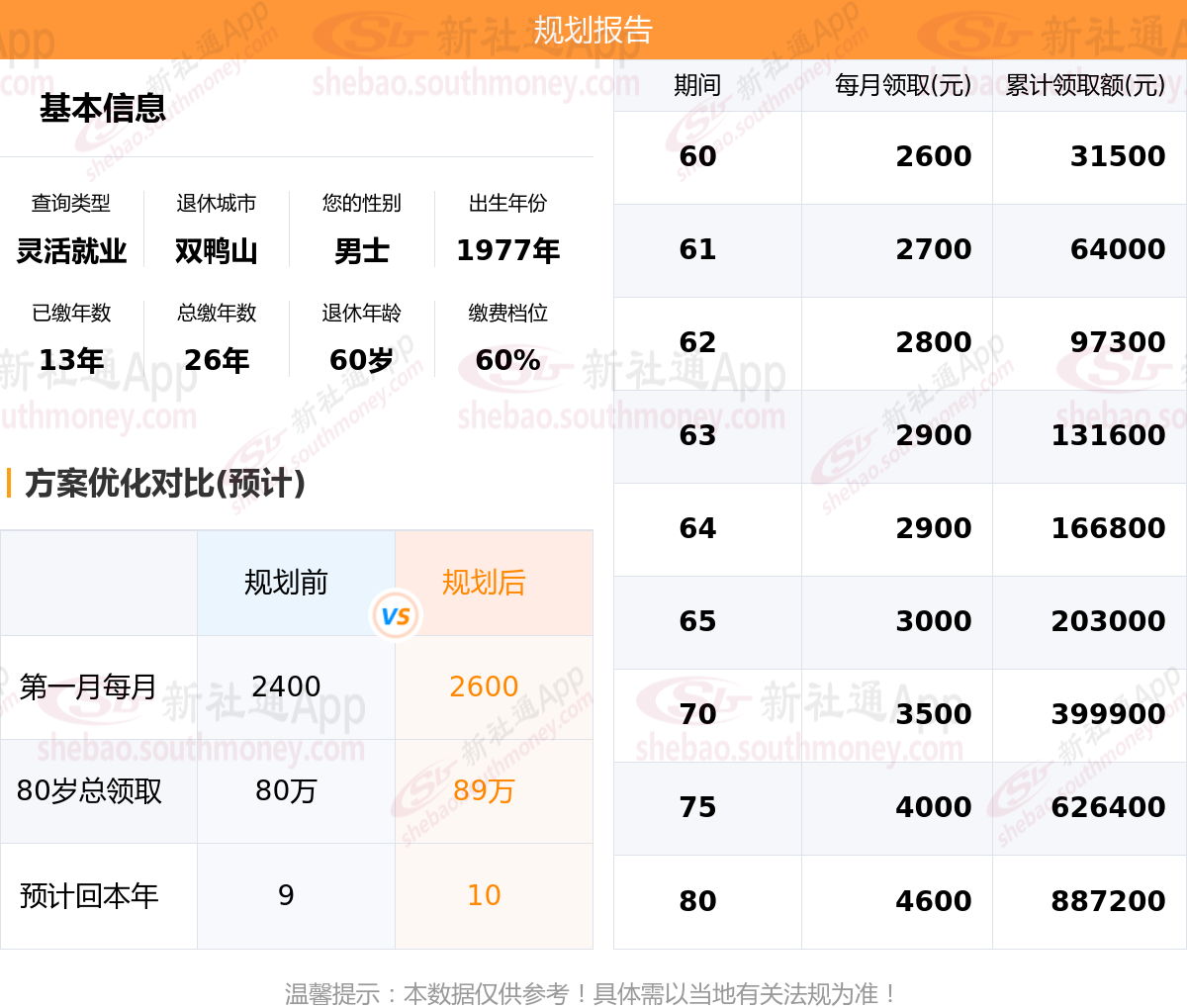 规划前:参保城市:黑龙江双鸭山,性别:男士,出生年月:1977,已缴年限:13年,总缴年数:26年,退休年龄:60岁,缴费档位:60%。