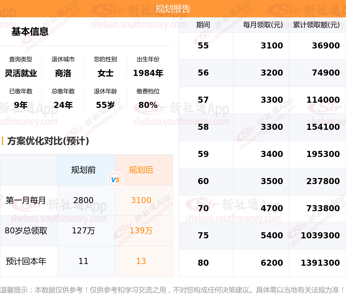 规划前:55岁第一个月约领2800元,新社通APP-养老金规划后:55岁第一个月约领3100元