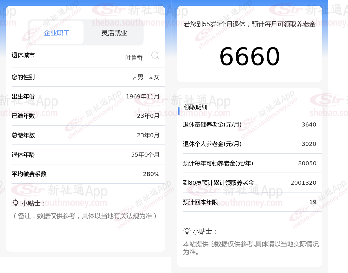 张某,拥有长达23年的养老保险缴纳年限,其缴费档次一直维持在较高的280%水平。基于这些详细信息,我们使用了新社通app养老金计算器,并参考了当前的养老保险法规,对他未来的养老金进行了如下估算: