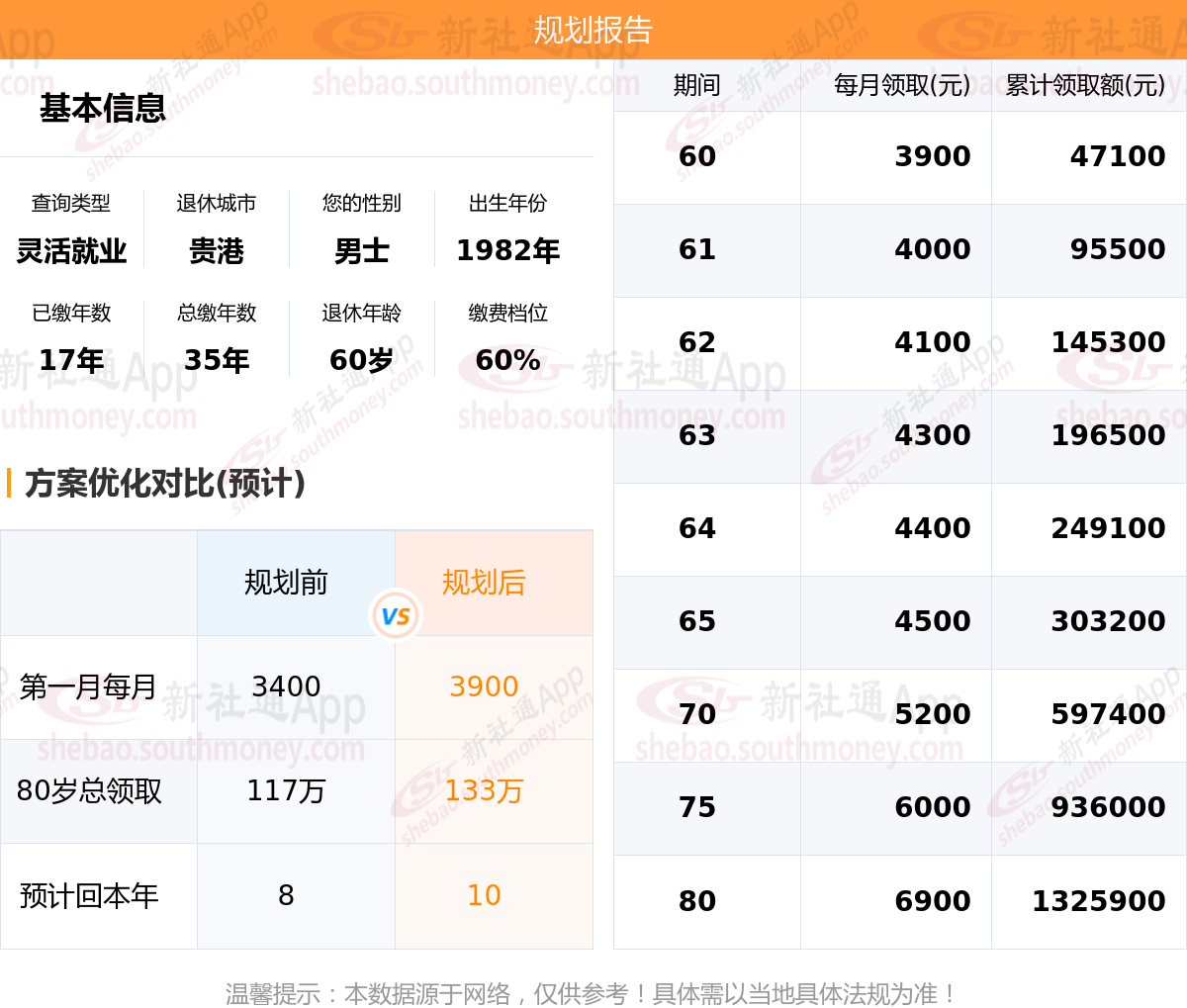 规划前:参保城市:广西贵港,性别:男士,出生年月:1982,已缴年限:17年,总缴年数:35年,退休年龄:60岁,缴费档位:60%。