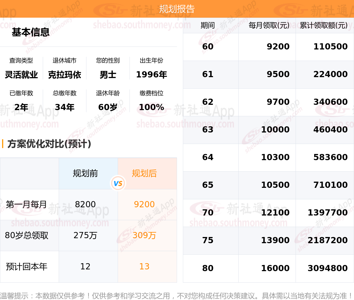 规划前:参保城市:新疆克拉玛依,性别:男士,出生年月:1996,已缴年限:2年,总缴年数:34年,退休年龄:60岁,缴费档位:100%。