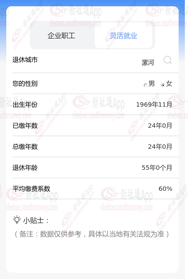 漯河的一位女性灵活就业退休人员向我们咨询了她的养老金问题。她出生于1969年,工龄为24年,且一直以来她的养老保险都是按照相对较高的60%档位进行缴纳的。她十分关心自己退休后每月能够领取的养老金数额,并询问我们,基于她的个人情况,她的养老金是否能超过1600元,以保证她退休后的生活质量。